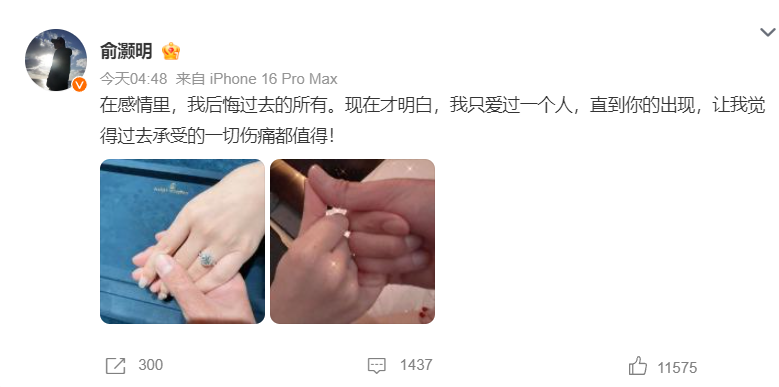 5月17日,男演员俞灏明晒出钻戒照和拉钩照,写道:“直到你的出现,让我觉得过去承受的一切伤痛都值得! ”照片中也有文字:“晨,四个月了,我真的很想很想为你戴上那只真正属于无名指上的钻戒,我爱你,永远……”